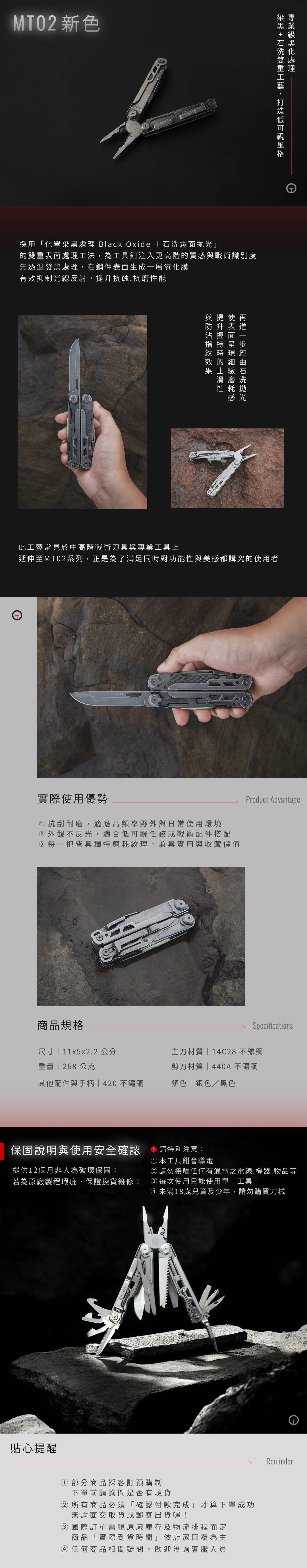 商品包含:MT02工具鉗(銀色/黑色)*1+套筒組*1+收納袋*1+K鞘*1+不鏽鋼餐具組*1+迷你版鋼製彈藥箱(黑色/沙色/綠色)*1